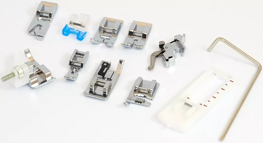 11-Piece Foot Set for Low Shank Snap-On Machines For use with most modern home sewing machines with a low shank. Includes shank which enables use of snap-on feet and quilting guide (also included). Great starter set. Includes: straight stitch foot, narrow hemmer foot, sliding buttonhole foot, button sew-on foot, zipper foot, cording foot, blindhem foot, overcast foot, zig-zag foot, shank, and quilting guide.