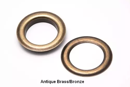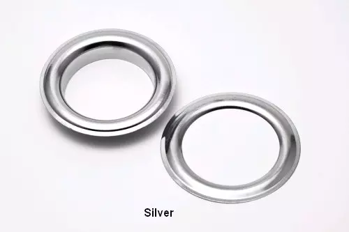 #15 Jumbo Curtain / Drapery Grommets (10 or 100 sets).rnrntOur largest grommets, size #15 are perfect for curtains, drapery and other large, heavy fabrics and materials. Inner diameter: 2″; outer diameter: 3″; depth: 11mm. rnAvailable in a variety of finishes. rnHow to set a grommet/eyelet:rnFor smaller projects, our hammer and anvil setter; may work fine. For larger volume applications, you may want to consider our Super Heavy Duty Press Machine + appropriate die. We also offer hole cutting tools for pre-punching holes before you set your grommet. While not required — especially for smaller sizes — it can be helpful to cut perfect holes beforehand.