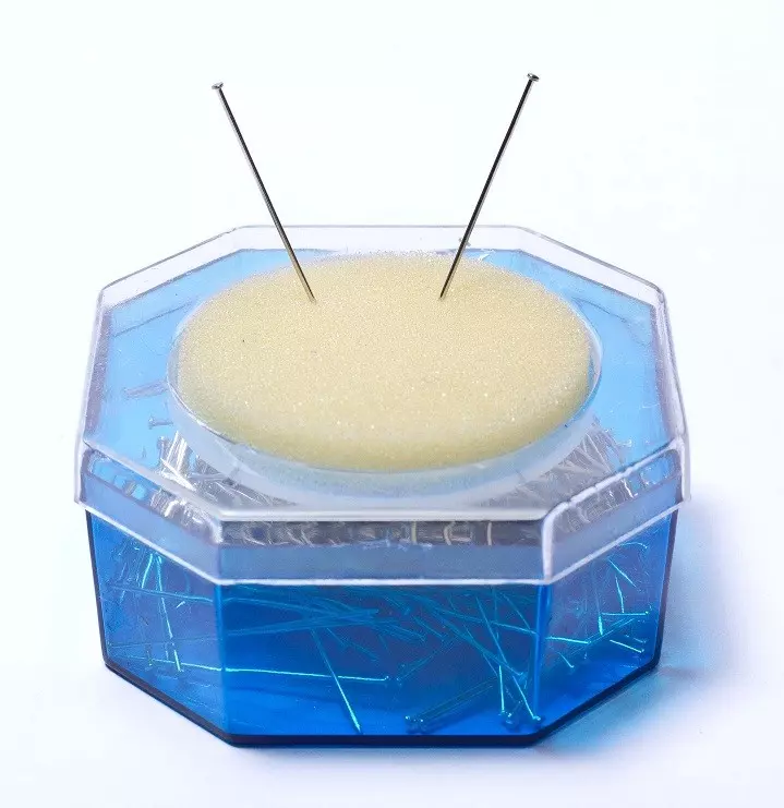 #20 Straight Stainless Steel Dressmaker Pins and Pin HolderrnStainless steel pins do not rust and are the strongest pins availablern#20 Stainless Steel Pins – Length 1 1/4″Approximately 300 Pins Per Box