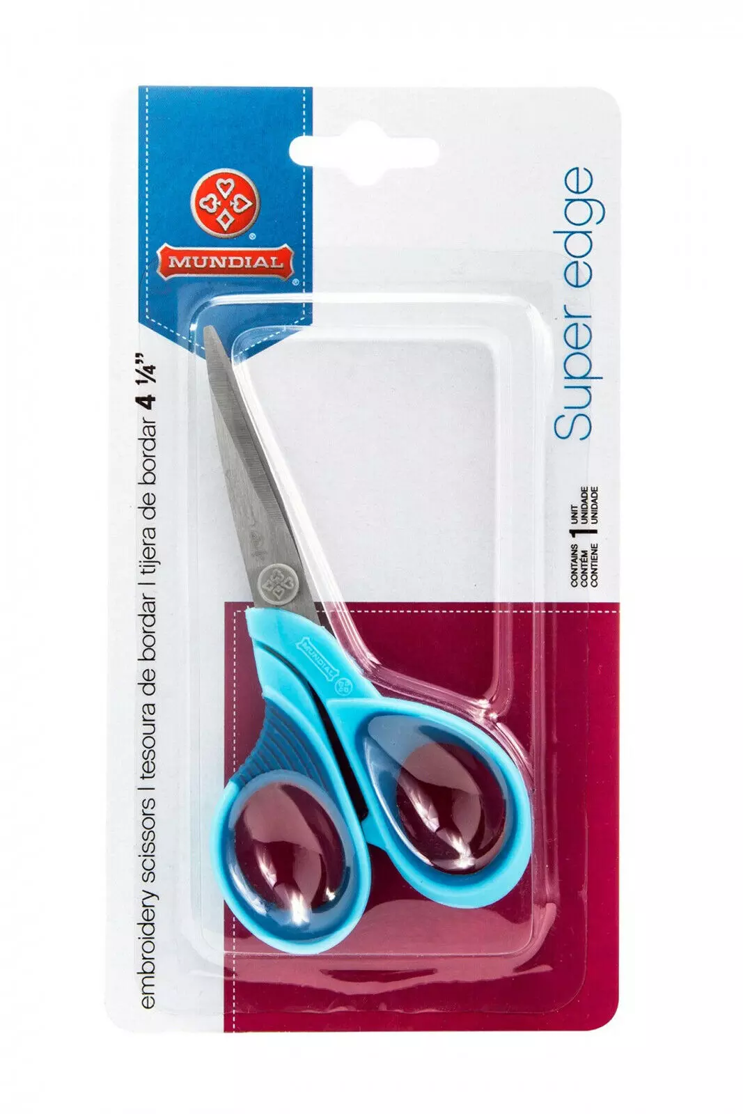 4 1/4″ Blue Super Edge Embroidery Scissors – Mundialrn4.25 inch Stainless steel bladesSoft material ring for added grip and comfort during useNon-Slip handles for better controlFastening system with carbon steel screw for increased safety and performance.