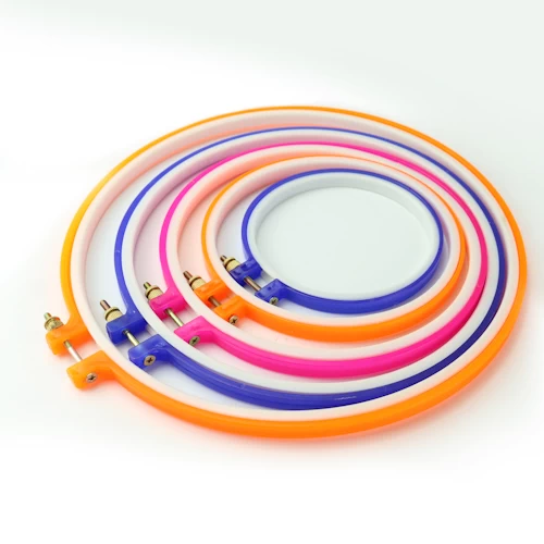 6 Piece Plastic Embroidery Hoop Set rnThe embroidery hoops have a brass adjustment screw that you can tighten when necessary to keep the fabric as tight as a drum. A unique design that upgrades the screw head is more significant, and a ridge design in embroidery ring for tightening. The uses for these are unlimited. rnColors may vary.rnSizes Included:rn12cm 15cm21cm24cm27cmrnMaterials: Made of high-quality plastic, strong, durable, and give you the smoothest feeling