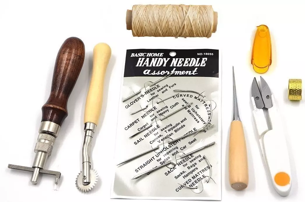 7 Piece Leather Craft Hand Stitching Tool SetrnrntHand Stitching Sewing Tool Set Kit Thread Awl Waxed Thimble Leather DIY Sewing set, Leather Tools 7pcs Set. Ideal for the basic DIY stamping set,Kit for beginner. Adjustable Leather Edge Stitching Groover Tool. 50 yards 1mm Sewing Waxed Thread 150D,50m .