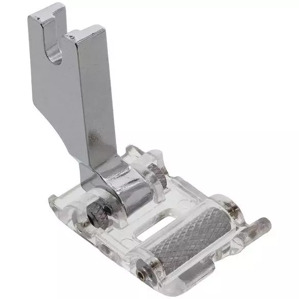 Clear Roller Presser Foot Part Number – 1856rnrntClear plastic presser foot for your High shank sewing machine. 5mm ZZ opening. Feed finicky fabrics through machine. roller will not leave imprints on fabrics. This foot’s grooved rollers provide more control and less friction when sewing on man-made leather, vinyl and some plush fabrics such as corduroy. Great for napped or slippery fabrics like silk, vinyl and velveteen.MACHINE COMPATIBILITY:rnArtisan Models: 196R, 5550N, 8500N, ZJ-100Brother Models: B705, B707, B715, B716, B735, B737, B738, B745, B755, B757, B758, B767, B781, PQ1300, PQ1500Consew Models: 30, 98, 99, 102, 103, 105, 210, 217, 218, 219, 220, 230, 231, 290, 310, 2230, 7360R-1Econsew Models: DDL-5550, DDL-8500, DDL-8700Feiyue Models: 8500, 8700Gemsy Models: 8700Janome Models: 1600P, 1600DB, 1600DBXJUKI Models: DDL-127, DDL-227, DDL-500, DDL-552, DDL-553, DDL-555, DDL-5550, DDL-5600, DDL-8300, DDL-8500, DDL-8700, DDL-8900, DDL-9000, TL-98E, TL-98Q, TL-2000Qi, TL-2010QMitsubishi Models: DB-120, DB-121, DB-122, DB-126, DB-130, DB-170, DB-189, DB-199, LS2-130, LS2-150, LS2-180, LS2-190, LS2-1130Necchi Models: BU, Supernova, and others with the high shank presser foot systemReliable Models: MSK-8800, MSK-8550M, MSK-8870MRex Models: RX8500Singer Models: 31-15, 95, 96, 120U, 121C, 121D, 188K, 191D, 195K, 196K, 241, 251, 281, 366K, 400W, 402W, 451K, 491D, 591D, 600W, 660A, 691D, 770D, 771D, 2191, 2491DSunstar Models: KM-123A, KM-123B, KM-137A, KM-137B, KM-146BL, KM-250Tacsew Models: 5550, 8500, 8500-T, T8700Taiko Models: TK-505, TK-510Yamata Models: FY8500, FY8700rnAnd many other comparable industrial lockstitch sewing machines.rnPresser Foot Shank Type: High ShankrnPresser Foot Type: Clear Roller Presser Foot