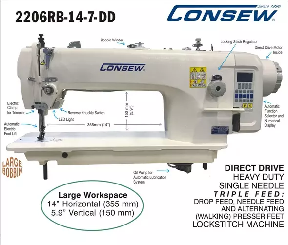 Consew 2206RB-14-7-DD Direct Drive Heavy Duty Single Needle Triple Feed, Walking Foot Industrial Sewing Machine Comes With Table, Legs, Servo Motor and LED LamprnFeaturing: Fully Automatic Functions with Display, Automatic Electric Foot Lift, Large Workspace, 14” Horizontal (355 mm) x 5.9” Vertical (150 mm), Automatic Lubrication System, Manual & Automatic Reverse With Knuckle Switch, Large Bobbin And Horizontal Axis Hook (side Load), 3 S.p.i.(8mm) Stitch Length, Locking Stitch Regulator, Standard Presser Feet Fittings.
