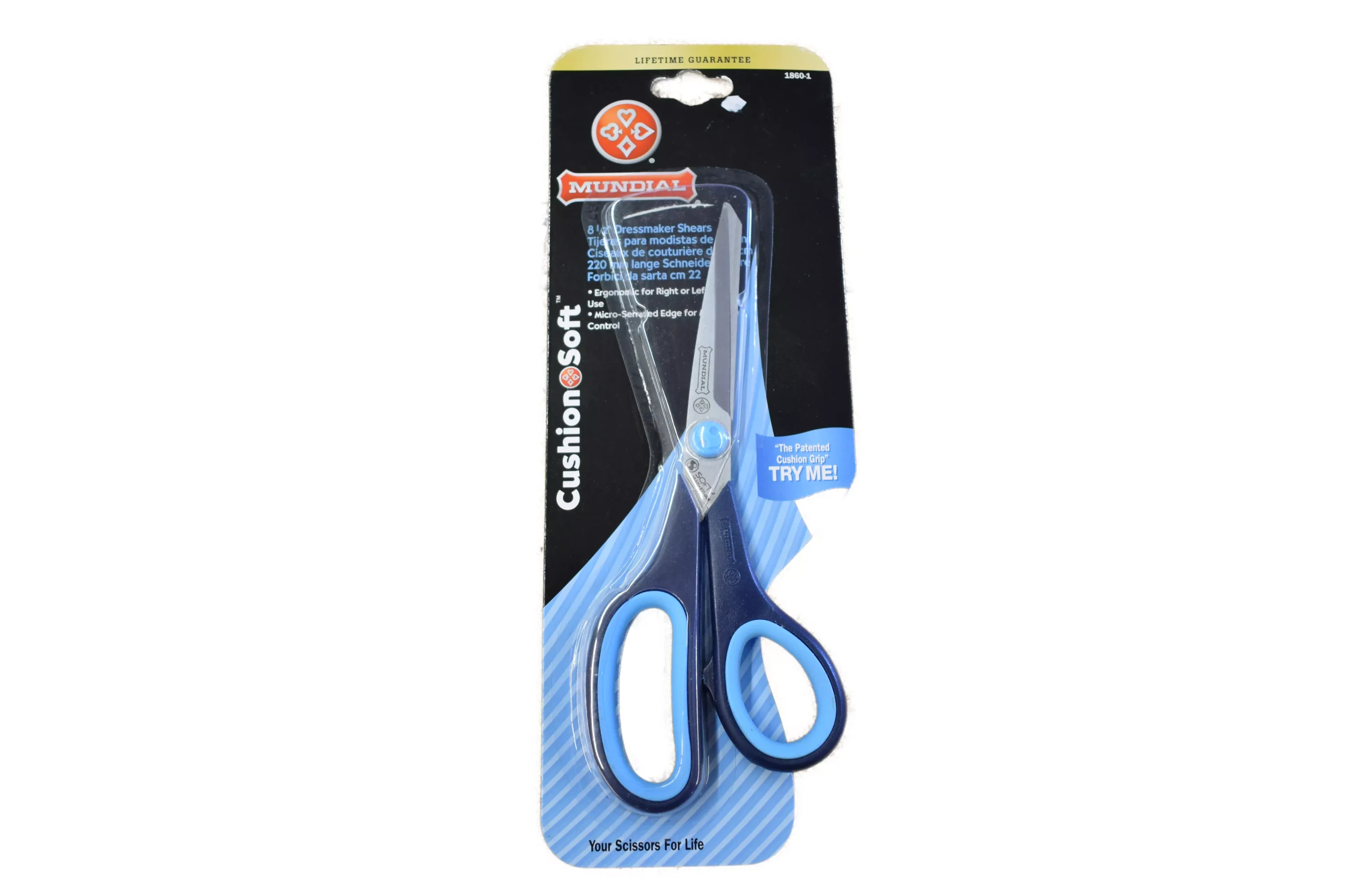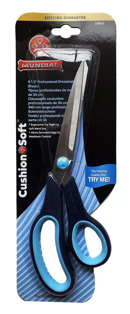 Dressmaker Shears With Cushion Handle – MundialrnMicro-serrated blade for a non-slip cutting edge; cushioned inserts and enlarged finger bows allow for longer periods of use; non-slip handles; stainless steel blades.rnAvailable Sizes:rnrn8-1/2″9″9-1/2″