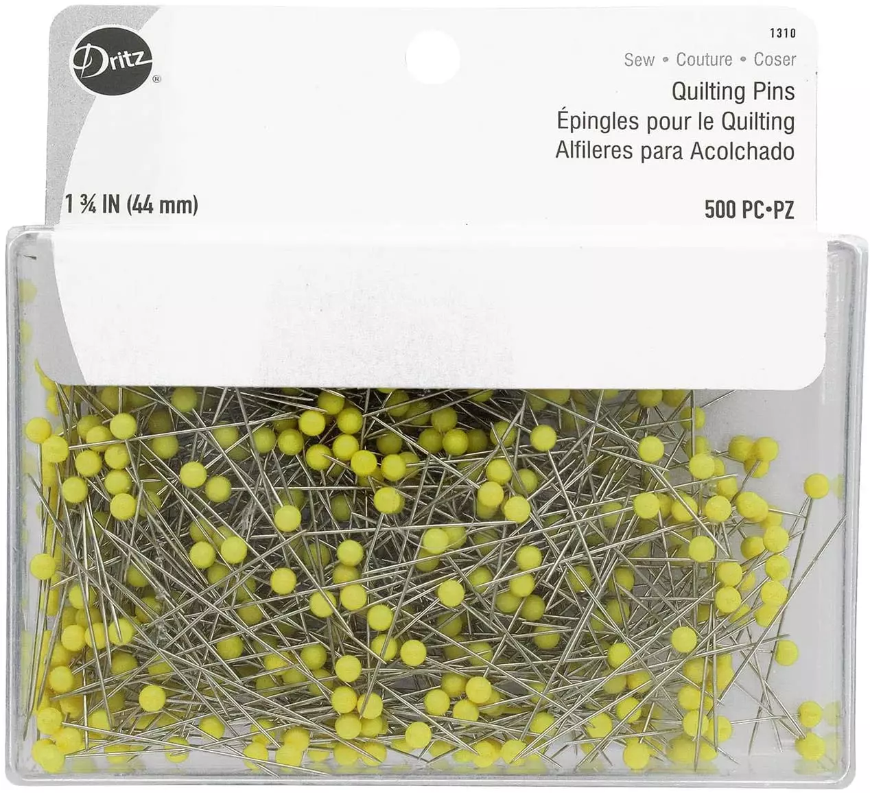 Dritz 1310 Quilting Pins – Yellow 1 3/4″ 500 PiecesSize: 1 3/4″ inchIdeal for holding multiple layers of fabric, loose weaves, synthetic furs, plush velvets and bulky fabricsExtra-long steel pins with yellow heads, packaged in a reusable plastic storage boxNickel-Plated SteelThis package contains 500 each of size 28 (1-3/4″) quilting pins