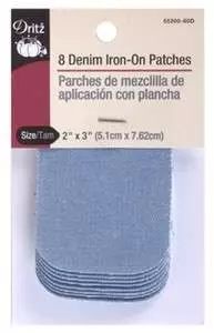 Dritz Denim Iron-On Patches (8 pack)rn8 piece small denim iron-on patches to repair tears on jeans, jackets, clothing, bags, and equipment. Ideal for medium to heavy weight fabrics.rnrn Machine washable and dry cleanable. Available in faded blue color.* rn Measures 3-inch length by 2-inch width.rnrnCheck fiber content of item to be repaired to be sure it can withstand the heat setting required for correct application. rn*Note: the color of the patches are slightly more faded looking than the photo would indicate. Color is a subtle light blue/light green.
