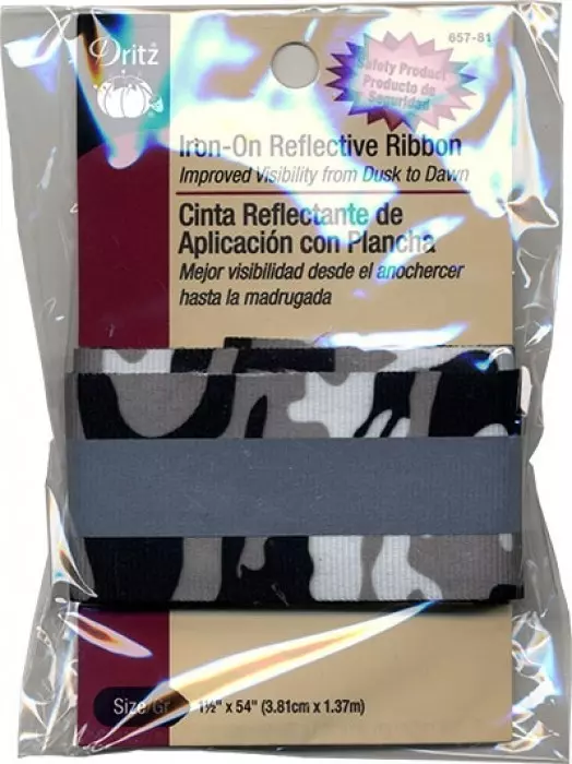 Dritz iron-on reflective ribbon pack will improve visibility from dusk to dawn. Easy to apply to most items that can sustain the heat of an iron; not recommended for nylon. Machine washable. Size: 1-1/2" x 54"