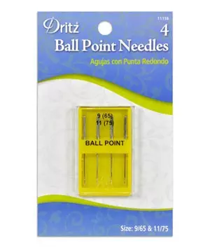 Dritz Ball Point Needles. Pack of 4. rnrn Ball point needles penetrate between the fibers of the fabric, not through the fibers like a sharp needlern Ball point needles are best suited to knit fabricsrn These needles are suitable for most models of sewing machinesrnrnSize 9/65 and 11/75