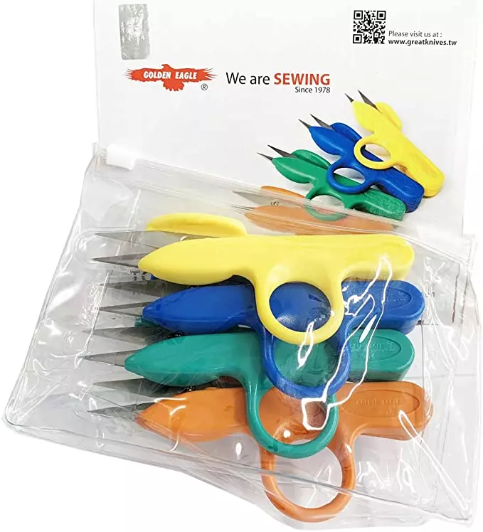 Golden Eagle TC-801 Thread ClippersrnGolden Eagle Thread Nipper features blades made of the highest quality steel to insure extra cutting life. Blades are ground to a sharp knife edge and sharp points. Lightweight frames of heavy-duty industrial strength plastic. Their positive spring action instantly reopens the blades after each cut.rnTotal length 4-3/4″, Cut length 1-1/4″Perfect for sewing, embroidery, quilting, needlepoint and cross-stitchSharp steel bladesLightweight body with finger holeColors may varyrnSold individually or in Pack of 12