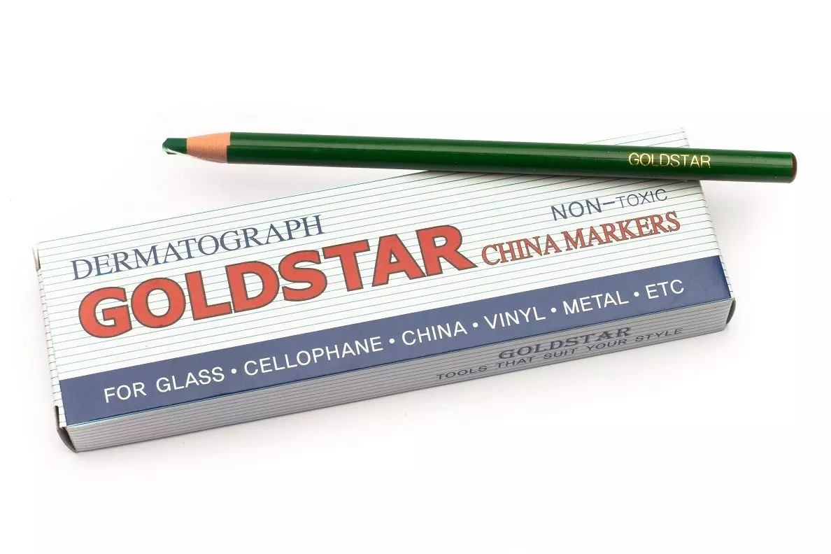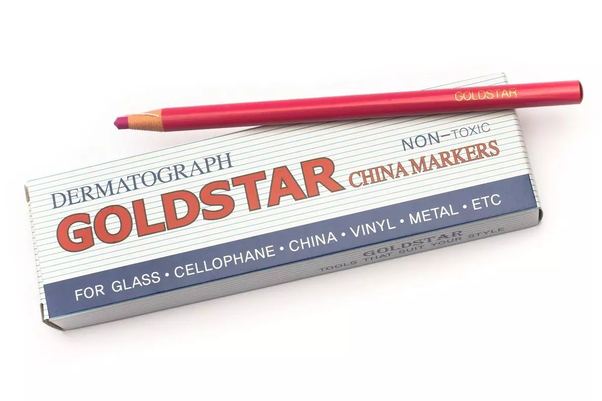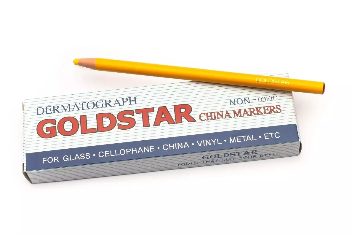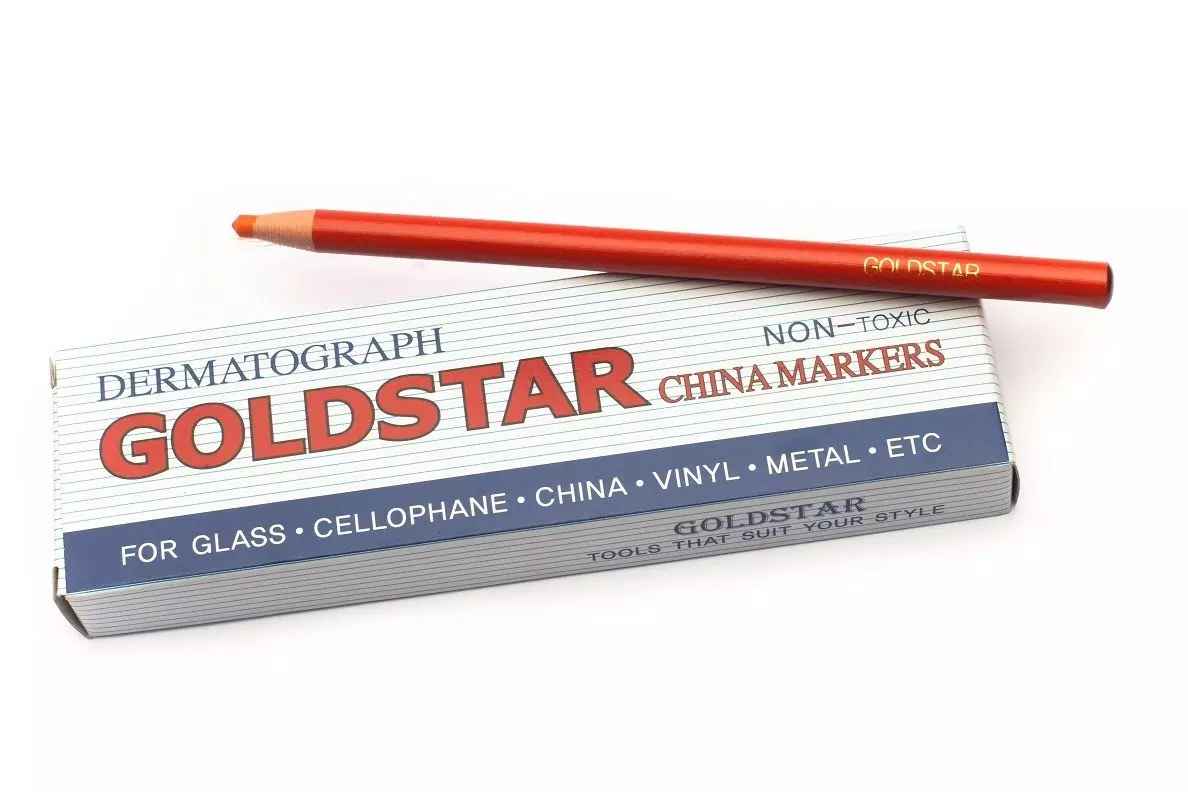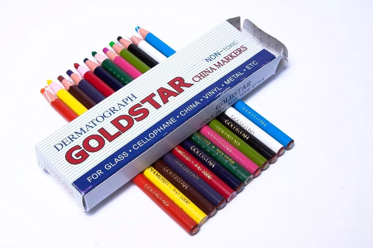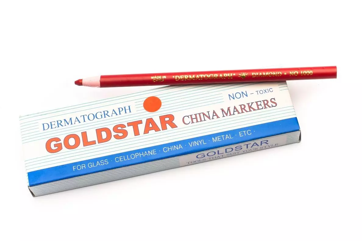 GoldStar China Markers Peel Off Grease Wax PencilThese GoldStar China Markers, also know as “Grease Pencils,” leave opaque markings without skipping on all types of shiny surfaces including glazed pottery, glass, plastic, metal, rubber as well as porous surfaces such as fabric, wood, and paper. Marks are water-resistant and colorfast. Can be easily removed from non-porous finishes.rnUsing the pull string easily exposes the paper wrapped core.rnPacked 12 pcs. per box.