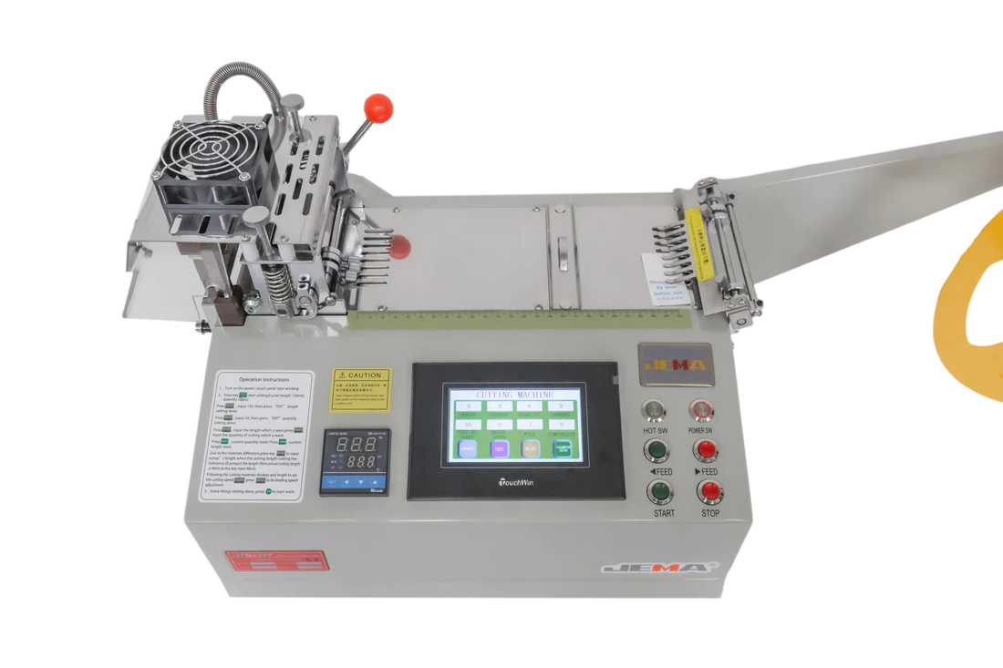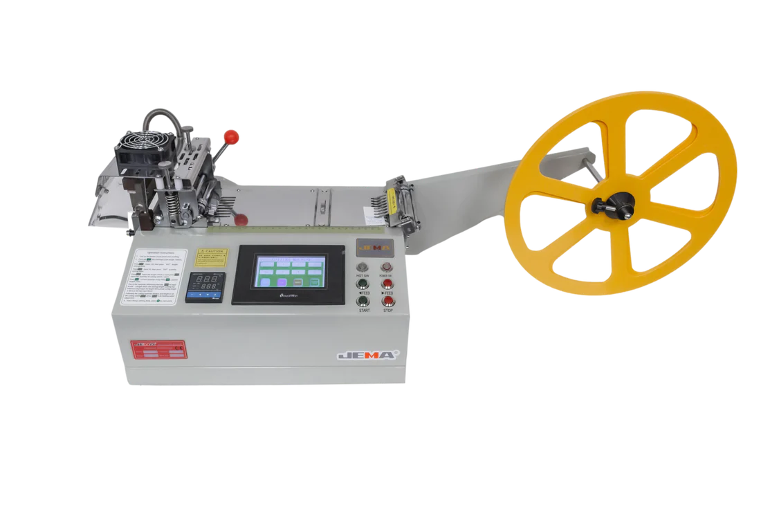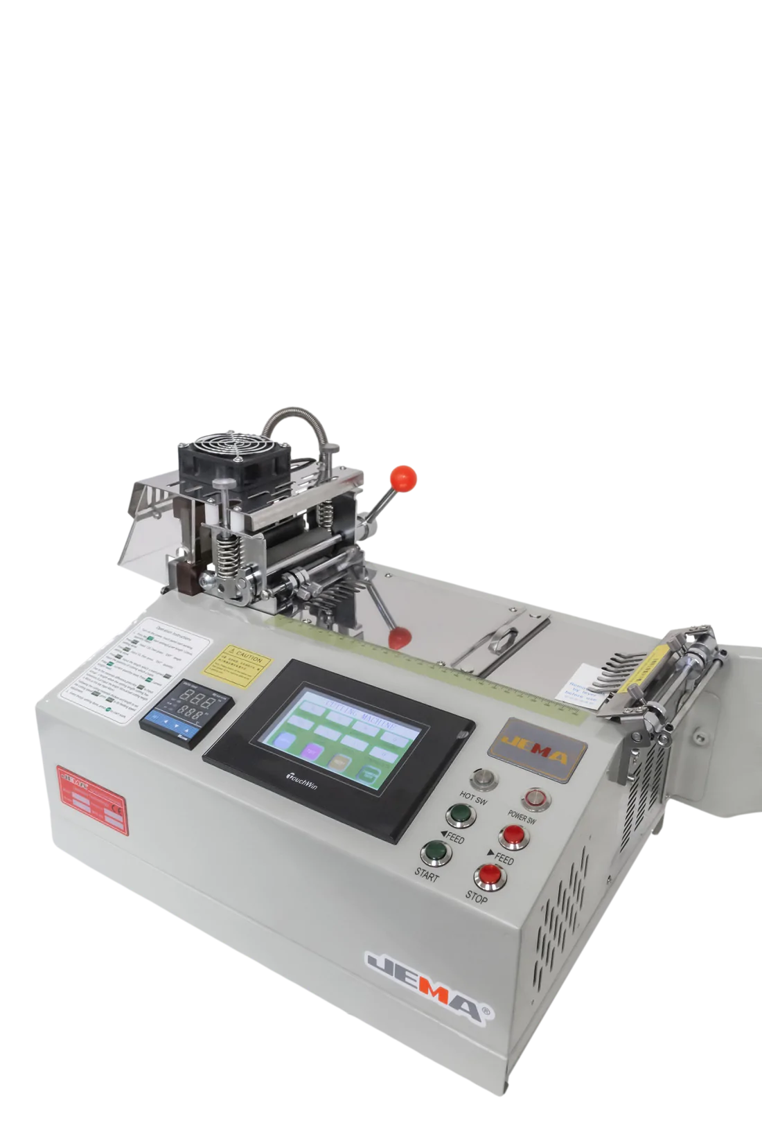 New Generation Pneumatic Electronic Hot Label Cutting Machine – Jema #JM-120EHSrnThis New generation hot cutting machine works automatically by only rnsetting speed, length, quantity, and temperature. It will stop rnautomatically if the material runs out during operation.rnIt can cut a wide variety of materials, such asrnStrip TapeRibbon TapeBag BandSmall WebbingrnMACHINE FEATURES:rnHigh Speed: Can cut 100-120 pieces per minute (50mm long)Accuracy: Adopt High-Accuracy Stepping Motor DriveTouch Control Panel System: Adopt PLC system, rnmultilingual conversion by the touch panel. The page of function is rnintuitive and easy to operate setting is convenientFault Self-Checking: Cutting sensor error, no supply; the error code will show on the system panel directly if the fault happened.Cutting Type: Melting and cutting by hot knife, the woven label is cut neatly without fraying but not for heavy materials and installed with an anti-static electricity device.Compensation: After inputting the actual length data, accurately cut out the length to meet the system settings.Maximum Cutting Width: 98mmCutting Length: 20 – 99999 mm