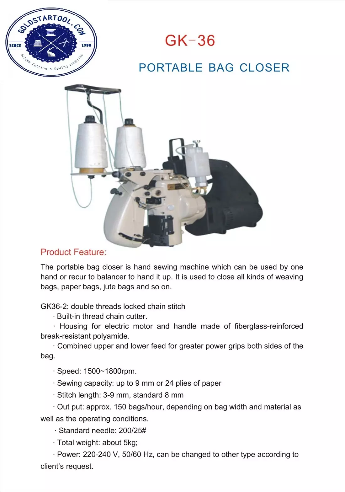 New-Tech GK2006-2 rnPortable Double Thread Heavy Duty Portable Bag CloserrnThis portable 2 thread bag closer is a hand sewing machine which can be used with one hand. It is used to close all kinds of woven bags, paper bags, and jute bags.