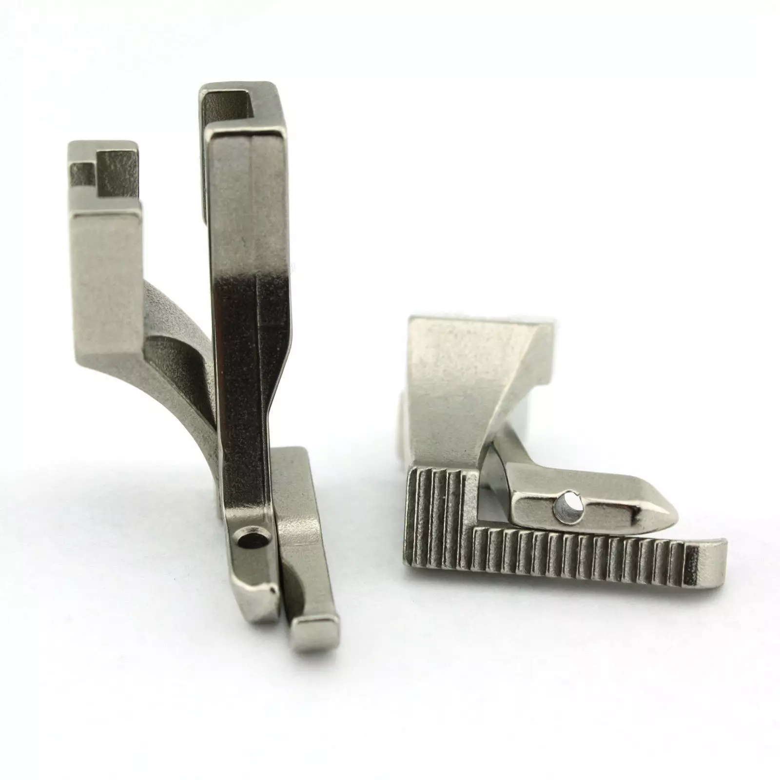 Right Toe Zipper Walking Presser Foot SetrnPart Number:rnU192R – Outside Presser FootU193R – Inside Presser FootrnThis set contains one outside foot and one inside foot. The outside foot has a single toe which allows close stitching to the zippers and edge sewing. The outside toe is on the left side. Zipper will go to the Right side of the foot. Outside foot have teeth on the bottom.rnMACHINE COMPATIBILITY:JUKI Models: DU-141, DU-141NH, DU-1181N, DU-1281-7Artisan Models: 797AB, 1797Brother Models: DB2-B797, DB2-B798Chandler Models: DY-337, DY-349Consew Models: 120, 145R, 146RB, 175RB, 199RB, 205RBFeiyue Models: FY-5318Gemsy Models: 318, 718, 818, 1808Global Models: WF-995, WF-3995Highlead Models: GC0318, GC0388, GC0398Mitsubishi Models: DY-330, DY-337, DY-340, DY-349, DY-350, LY-3300Nakajima Models: DBU-180L, 181L, 280LNeels Models: NS-0302New-Tech Models: GC-0303Reliable Models: MSK-8300Rex Models: 11-155Sunstar Models: KM-340, KM-341Typical Models: GC6-6Zoje Models: GC0318-1, GC0618Yamata Models: FY-5318rnAnd many other comparable walking foot machines.rnPresser Foot Shank Type: High ShankrnPresser Foot Type: Zipper / Cording / Welting / Piping