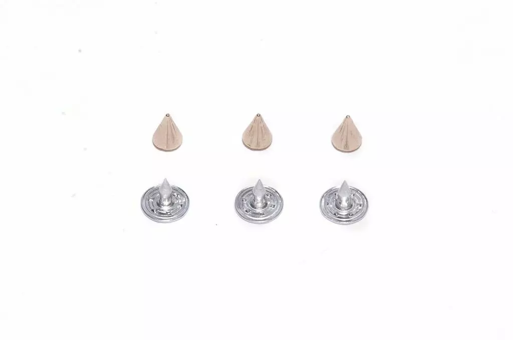 PRODUCT DESCRIPTION:rnSpiked Rivets are used as a decorative accessory that primarily holds two different quality materials together. The designer rivets with smooth finish and surface, not just looks marvelously beautiful but holds two materials securely without letting the material slip. Use Spiked Rivets on bags, leather, crafts, purses, ribbons, hand bags, clutch and belts, along with numerous other objects too. The material is strong and sturdy enough to hold the fabrics perfectly and that too without getting deformed. The rivets withstand the normal wear and tear. Use a setting tool to embed rivet with proper alignment on the desired material. It is widely used by the crafters for mixed media craftwork. rnFEATURES:rnDESIGNER RIVETS: The spiked-shaped rivet makes a perfect decorative element that are widely used to uplift the overall appearance of fabrics and canvas. The classic-designer rivets are specifically designed to hold the materials in a secure manner without slipping. rnEASY-TO-USE: Keep spiked shaped rivets in your fixing tool kit; these are easy to use and can be embedded on any material using a hammer/anvil hand setter for proper alignment. Poke a hole on desired surface that helps to push the rivet smoothly and place it securely. rnSMOOTH FINISH: The designer dome rivets are designed using a special plating process that ensure smooth, and shiny surface. The quality finish not just boosts the appearance but it adds to the durability and makes it sturdy enough to withstand every day usages.rnVERSATILE: Use DIY craft rivets can be easily embedded on fabrics including jackets, jeans, or simply use it for mixed-media craft projects. Fix the spiked rivets on shoes, belts, wristbands, hand bags, clutch or any other desired material. rnSPECIFICATIONS: The 6mm Spiked Shaped Rivets in Silver or Gold finish is available in a pack of 100. rnOur special plating process to makes for shiny smooth finished metal locks. Use with our other coordinating hardware. rnrnTo apply your rivets you may be interested in our grommet press machine and die set