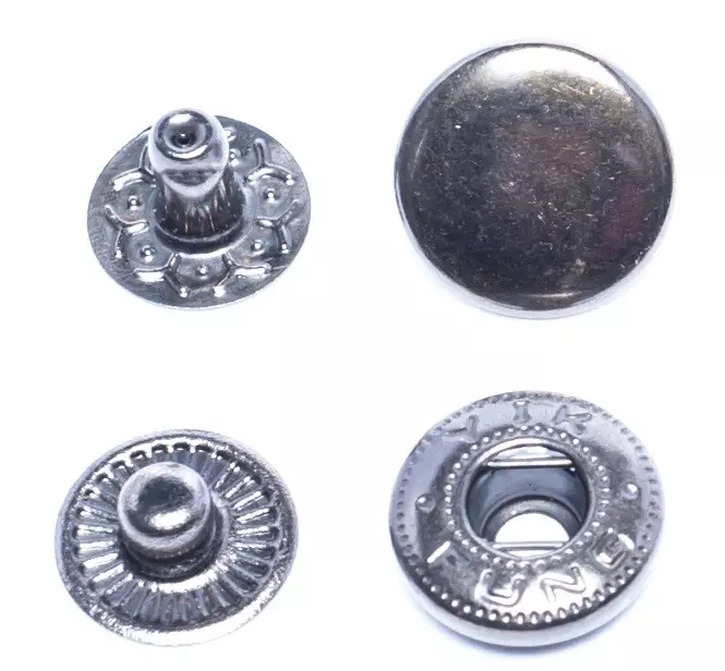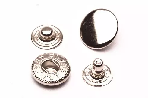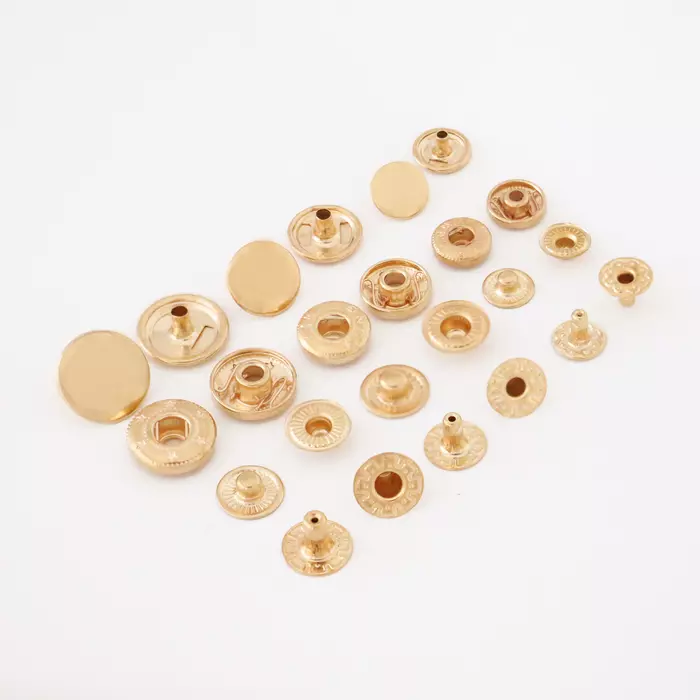 Standard Spring Snapsrn4 parts per set, 100 sets per pack. rnOur fashion spring snap uses a spring socket and a post-attached stud. It has a gentle action and is suitable for use with lightweight, medium or technical fabrics. The spring is enclosed, which protects it from foreign contamination, and tends to maintain its consistent snap action over the life of the garment, even under harsh conditions.rnWe carry the following sizes:rnrnDiameter: 10mm (3/8″); 16 Ligne; Length of post: 5.75mmrnDiameter: 12.5mm (1/2″) 20 Ligne; Length of post: 7mmrnDiameter: 15mm (5/8″); 24 Ligne; Length of post: 7.3 mmAvailable Colors: Gold, Rose Gold, Silver, Gun Metal, Copper, Black, White, Antique BrassMaterial: IronrnChoose options from the pull-down menu.