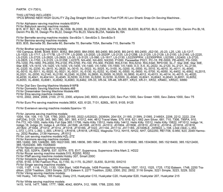 Zig Zag Straight Stitch Presser Foot for Low Shank Sewing Machines rnPart Number – CY-7301LrnMACHINE COMPATIBILITY: rnAlphasew Models: 653FABabylock Models: B15, B17, B21, BL1108, BL1170, BL1556, BL2000, BL2200, BL2300, BL25A, BL500, BL6200, BL6700, BL9, Companion 1550, Denim Pro BL16, Denim Pro BL18, Design Pro BL22, Design Pro BL23, Maria BL23A, Natalie BL18ABrother Models: 150 Campus, B346, B349, B351, B352, BM-2600, BM-3500, BS-2400, BS-2430, BS-2410, BS-2450, JS2130, JS-23, L25, L30, LS-1217, LS-1520, LS-1717, LS-1717B, LS-1717P, LS-2000, LS-2020, LS-2020P, LS-2125, LS-2125B, LS-2125i, LS-2129, LS-2150, LS-2160, LS-2220, LS-2320, LS-2725, LS-2820, LS-2920, LS-30, LS-3125, LS-590, LS-1817, LS-2130, LS2250PRW, LS2300PRW, LS2350, LS2400, LS-2720, LS-2825, LX-1700, LX-3125, LX-3125E, LX2375, NX-400, NX-600, NX200, P1000,Pacesetter PS21, PC-15,PE-300+Janome Models: 1004, 104, 108, 110, 128, 1780, 2003, 2018S, 2022 (US2022), 2039SN, 2041SX, 2118S, 2139N, 2139S, 2149SX, 2206, 2212, 2222, 234 (HF234), 3125, 3128, 345, 360, 380, 381, 393, 41012, 444, 4612 Travel Mate, 575, 618, 621, 662 Jem Silver, 681, 710, 7306, 795FA, 910, FA-772, HD-1000, Hello Kitty Full Size 385.11706, Hello Kitty 13512, Hello Kitty 14412, Hello Kitty 15312, Hello Kitty 15822, HF1012, Indigo 14, Indigo 18, Indigo 20, Indigo 4, JA1504, JA1506, JA1508, JA1510, JA1512,JD1804+JUKI Models: HZL-27ZKenmore Models: 385.12492, 385.1249280, 385.16221300, 385.18836, 385.18841, 385.19153, 385.19153690, 385.15343600, 385.15218400, 385.15212400, 385.15202400, 385.15208400Singer Models: 1105, 1107, 1116, 1120, 1130, 1304 Start, 1408 Prelude, 1408 Promise, 1409 Promise, 1507, 1512, 1525, 1725+rnAnd many other comparable low shank sewing machines.rnPresser Foot Shank Type: Low ShankPresser Foot Type: Zig Zag Straight Stitch Presser Foot